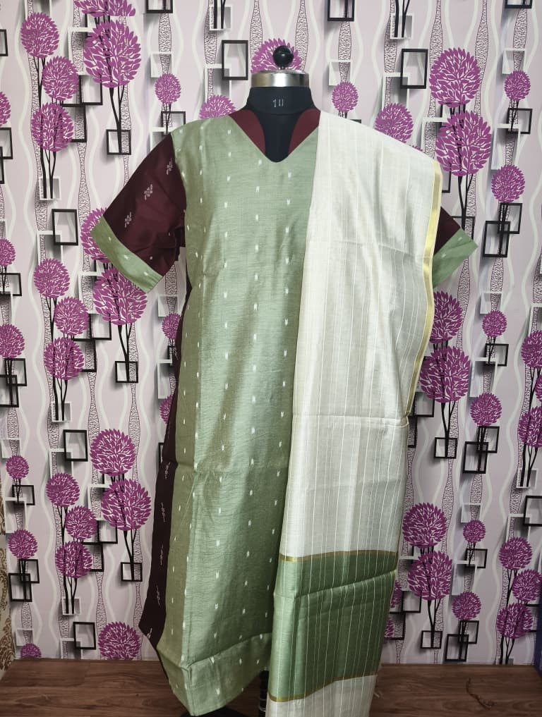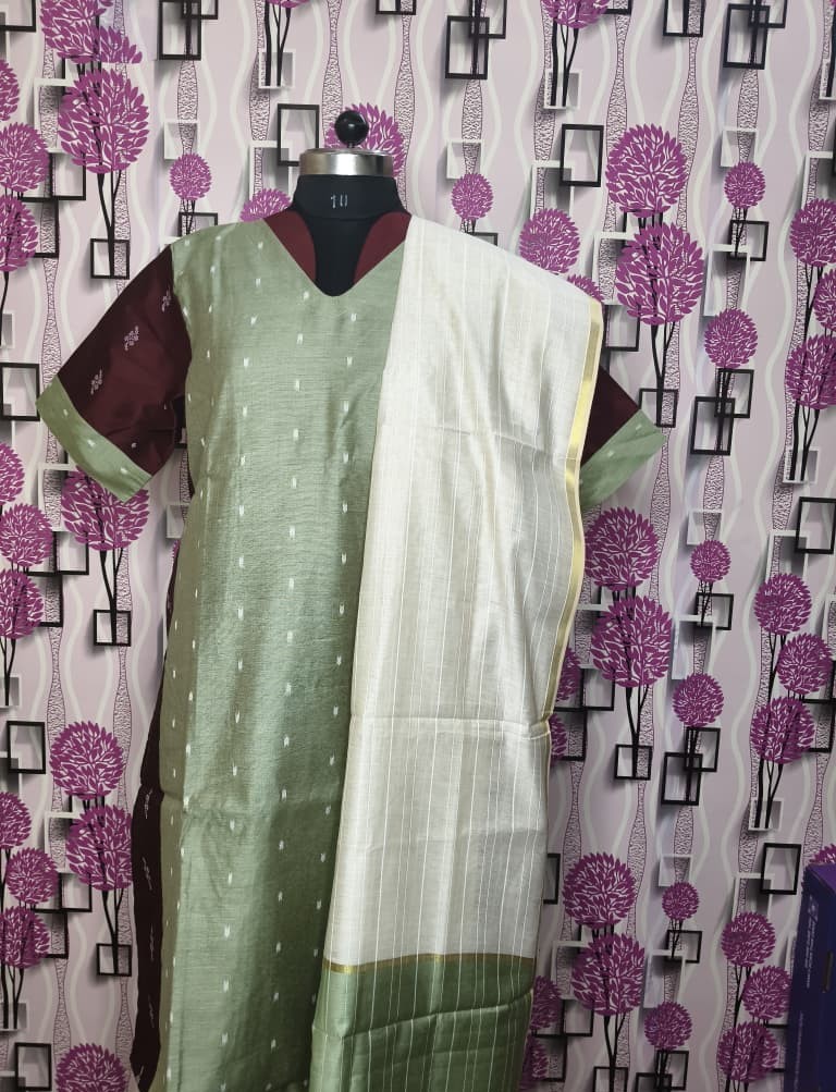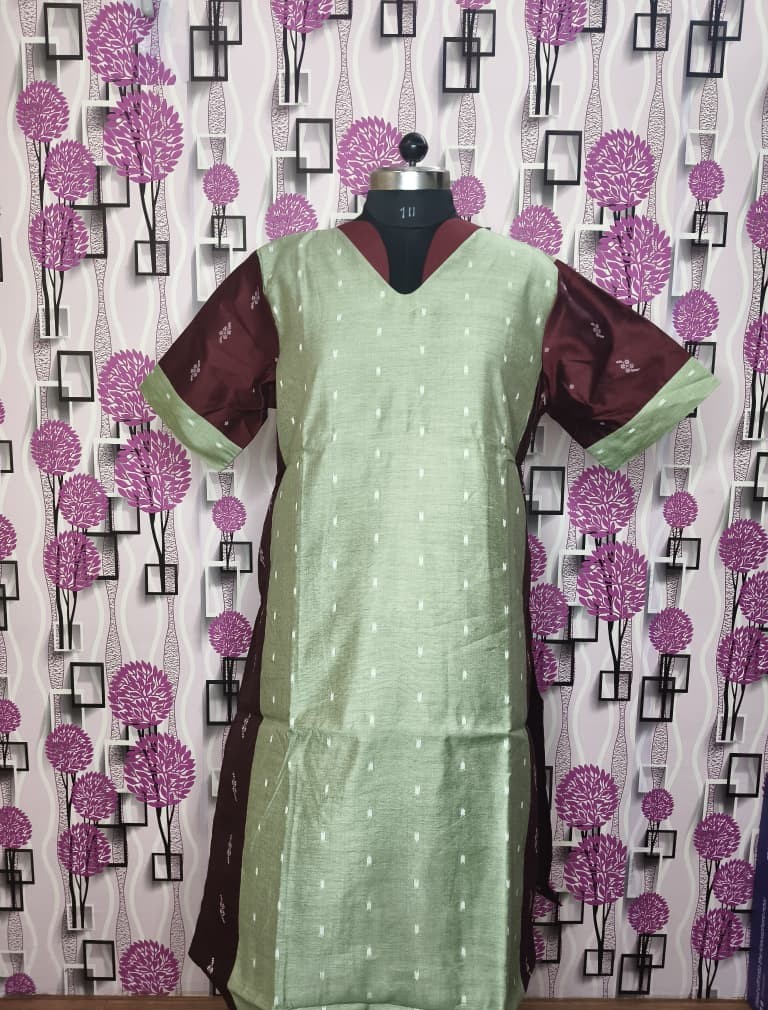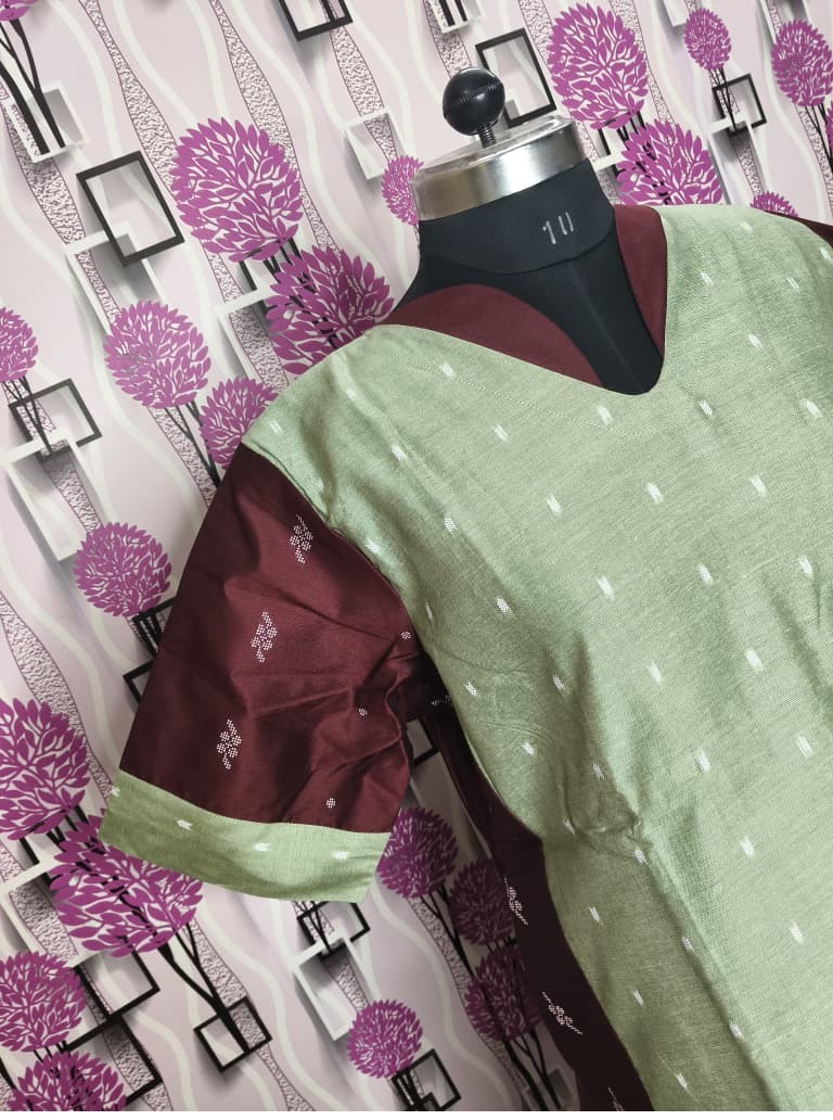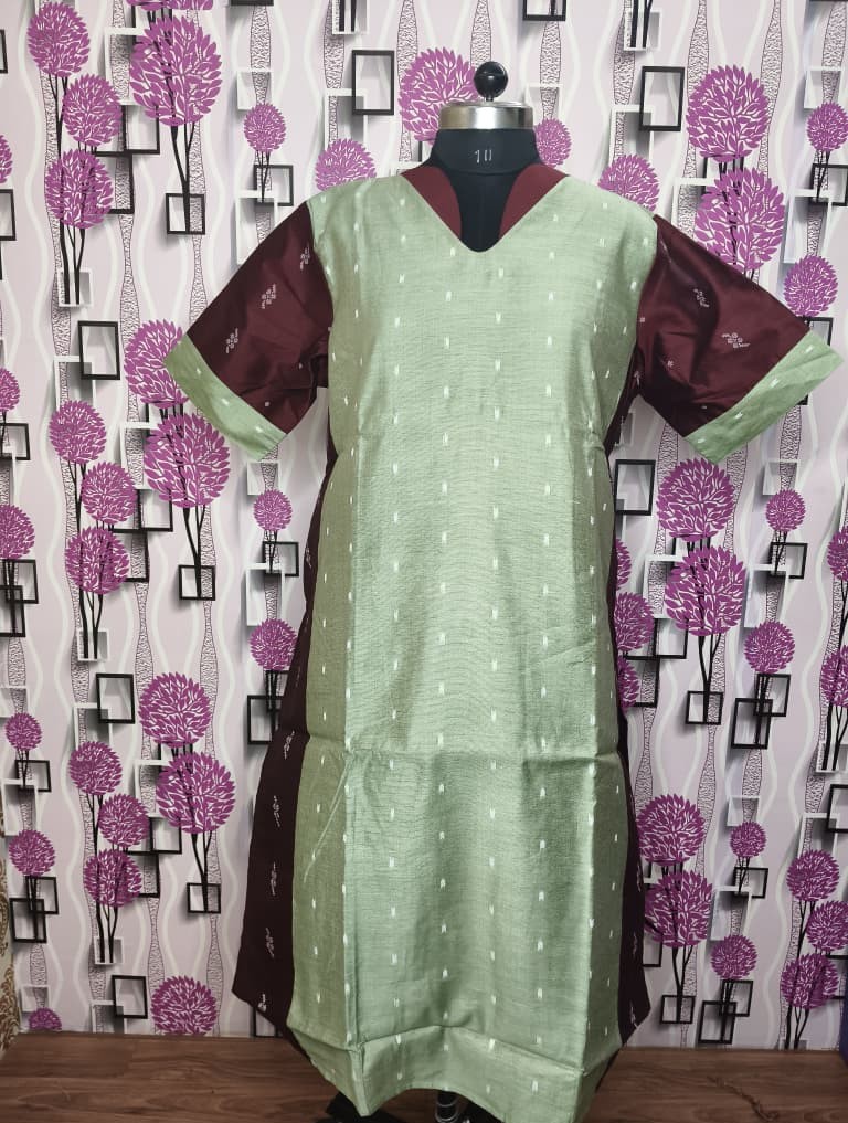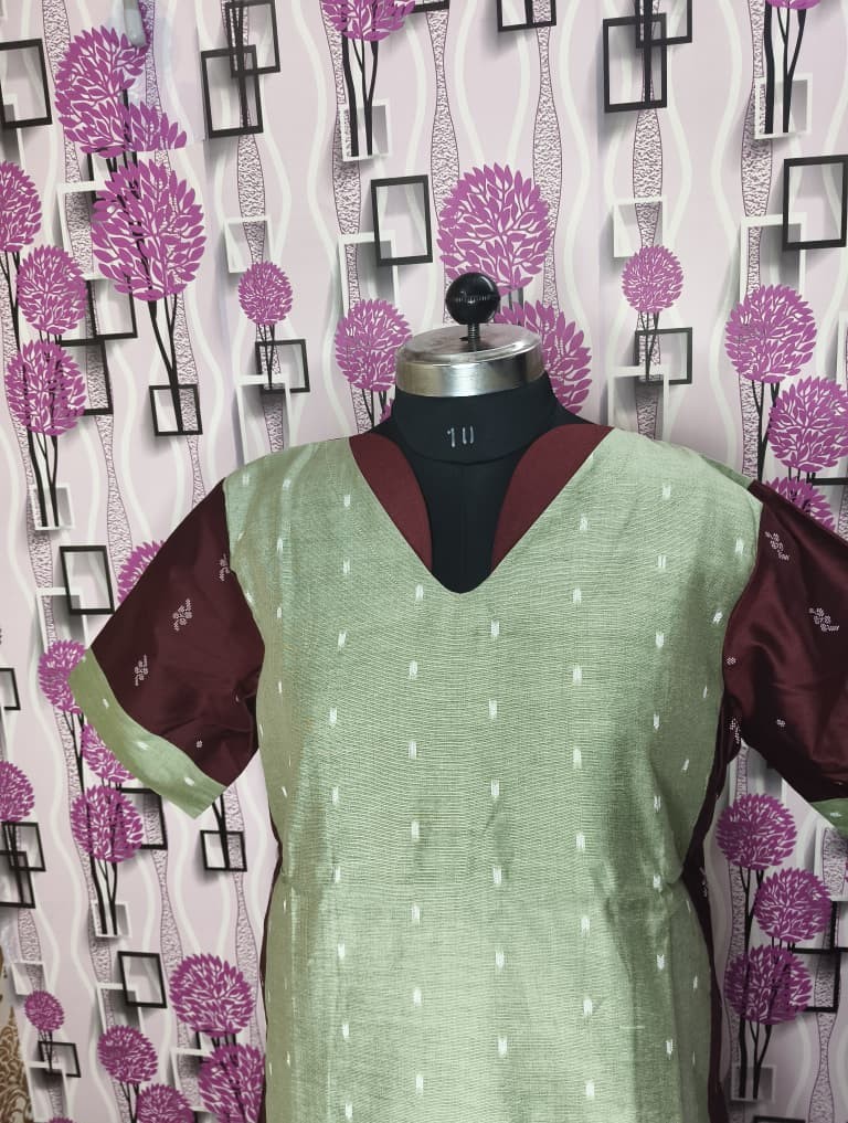 Upgrade your ethnic wardrobe with this premium Raw Silk kurti in a beautiful sea green shade paired with rich maroon contrast sleeves. Designed with a flattering V-neck and subtle woven butti detailing, this outfit gives a classy and sophisticated look perfect for festive occasions, family functions, and office wear.
